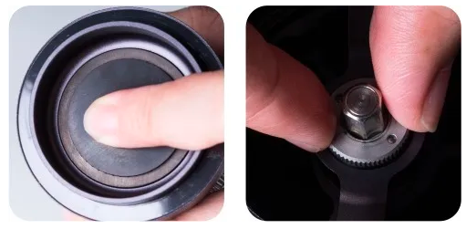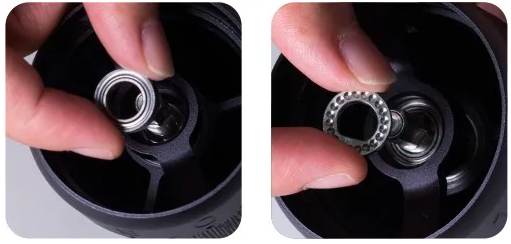 ![]() | Plaats het bovenste lager vanaf de bovenkant terug. Druk de braam van onderaf aan, Plaats de bovenste lagerkap terug. De kant met De concave stippen wijzen naar boven, en de U-vormige Het gat past precies op de as. |