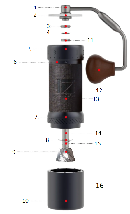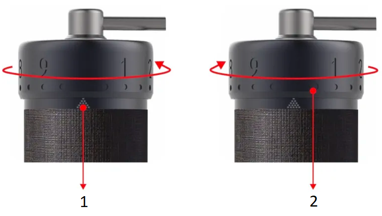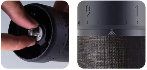 - De molen is direct klaar voor gebruik. Draai de instelring tegen de klok in helemaal tot het beginpunt waar je weerstand voelt en de slinger niet meer vrij kan draaien. De #0 moet uitgelijnd zijn met de schaalverdeling en de onderkant van de instelring moet de eerste streep van de schaalverdeling raken.