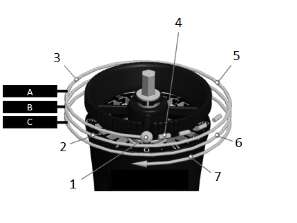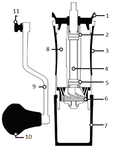 De grinder bestaat uit drie hoofdonderdelen: (A) afneembare aluminium handgreep, (B)