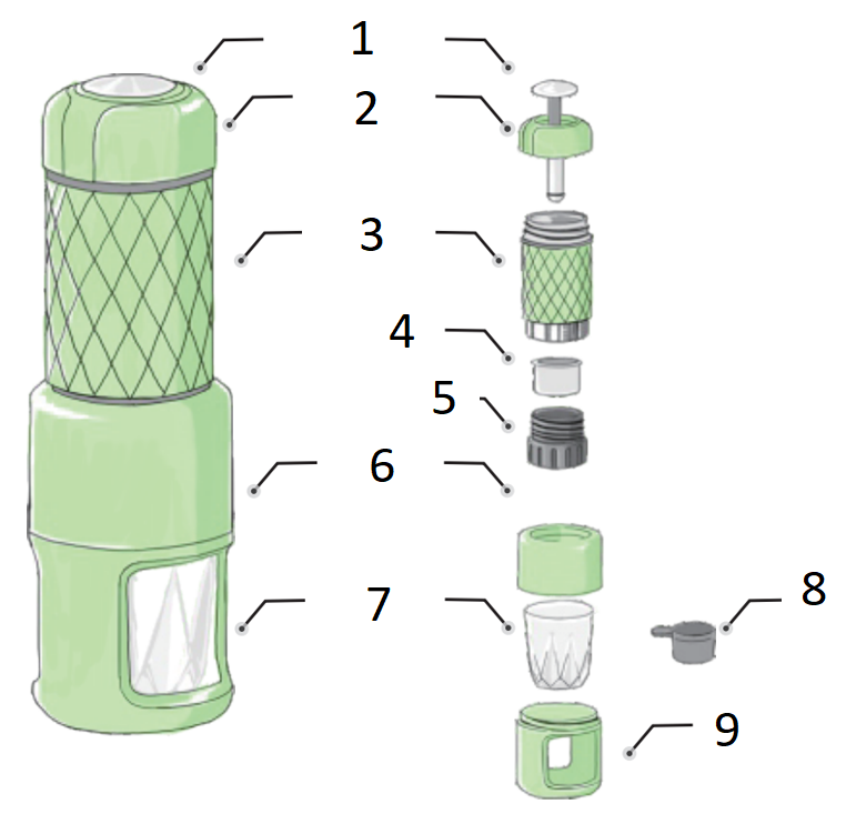 - Vul het koffiefiltermandje met gemalen koffie (7-10 g) en druk zachtjes aan met de onderkant van de maatbeker.