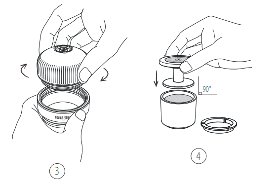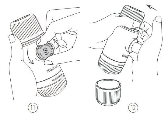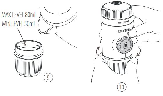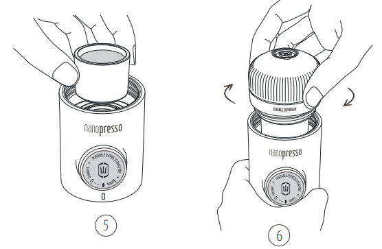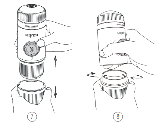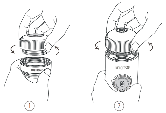11. Ontgrendel de zuiger uit zijn slagpositie. 12. Houd de NanoPresso met beide handen vast, zoals afgebeeld. Begin met pompen boven een kopje. Pomp langzaam tot alle koffie eruit komt. | ![]() |